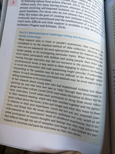 I am thrilled to see that music elicitation as a method has been picked up by Dr Amanda Holt in her new text book on ‘Family Criminology’. She dedicated a whole sub-section on arts based interview techniques and used my work as an example. The concept of family criminology is one that I really appreciate. It has been often the case in criminology that the focus is on individual offending patterns and on criminally responsible adults instead of looking to the wider familial context. In Holt’s book she looks at the impact of stigmatisation on family groups, families who engage in organised crime, abuse and violence within families. As we know in the domestic violence field, often the source of most risk to individuals of harm and murder lies within the confines of the ‘home’ environment. This book will be a valuable resource to those of us who focus on the private space and the relation to crime.
