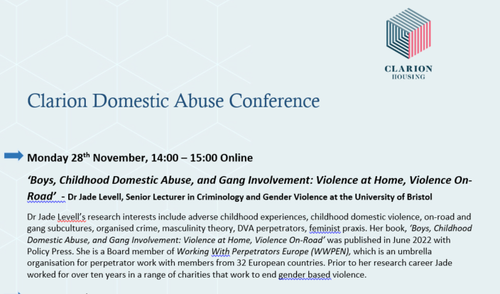28th November: I am so excited to be doing a webinar as part of Clarion Domestic Abuse Conference on my book ‘Boys, Childhood Domestic Abuse and Gang Involvement: Violence at Home, Violence On-Road’.